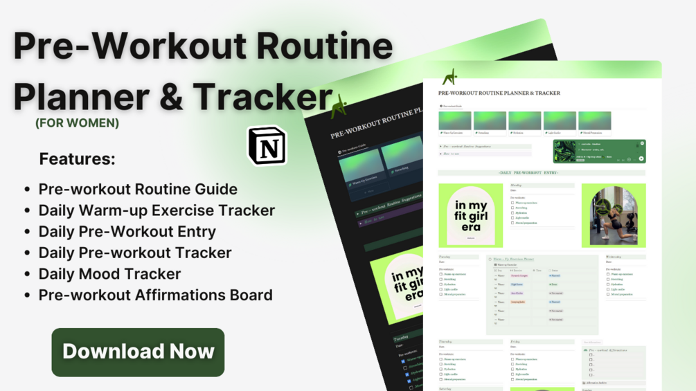 Introducing the Ultimate Pre-Workout Routine Planner and Tracker Notion Template for Women: Your Personalized Fitness Companion for Maximizing Gains!