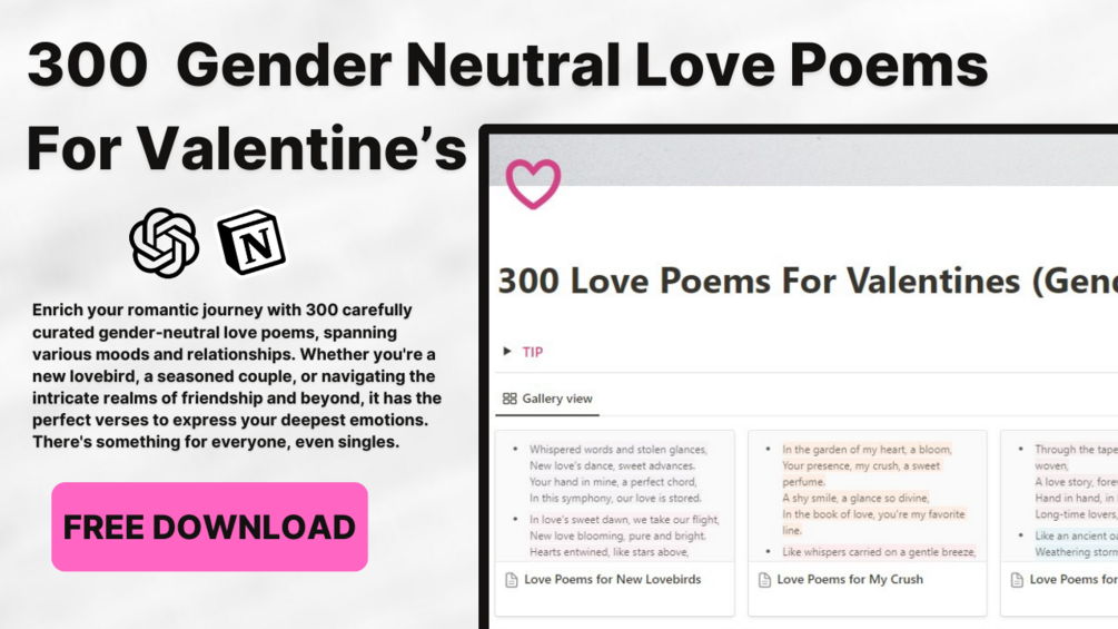 Introducing 300 Gender-Neutral Love Poems for Valentines, the digital treasure trove designed to ignite passion and infuse romance into every facet of your love life. Crafted with finesse, this collection transcends boundaries, capturing the essence of love in all its diverse forms.